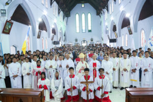 မန္တလေးကက်သလစ်ဂိုဏ်းချုပ်သာသနာ၊ စိန့်ဂျွန်း သာသနာစီရင်စု၌ ပထမကိုယ် တော်မြတ်နှင့် ခရစ္စမား အားပေးခြင်း စက္ကရမင်တူး ခံယူခြင်းမစ္ဆားတရားတော်မြတ်ကို (၃၊၈၊၂၀၂၅) တနင်္ဂနွေနေ့ နံနက် ၈:ဝဝ အချိန်တွင် စိန့်ဂျွန်းဘုရားကျောင်း၌ ဆရာတော်ကြီး မာကု ဦးတင်ဝင်းမှ ဦးဆောင်ပူဇော်ပေးခဲ့ ပါသည်။